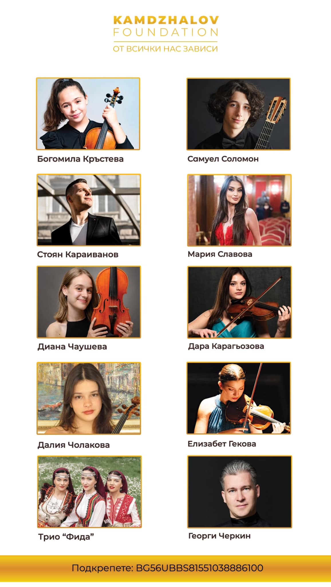 Die Stiftung „Yordan Kamdzhalov“ widmet sich ganz der Entwicklung des kreativen Potentials des Menschen. Sie wurde 2010 mit der Haupttätigkeit gegründet, jährliche nationale Wettbewerbe zu organisieren und durchzuführen, um junge Talente zu fördern. Die Stiftung als Organisation, Auftrag und Tätigkeit ist ein einzigartiges Phänomen im internationalen Kulturleben. Dank des Engagements Hunderter außergewöhnlicher Menschen, die die Arbeit würdigten, entwickelte sich der Wettbewerb für junge Talente nach und nach zu einer konzeptionellen Kultur- und Bildungsplattform, die auch eine Akademie für den Menschen ins Leben rief. Die gesamte Mission der Stiftung und von Yordan Kamdzhalov persönlich ist der Zukunft, dem Talent, dem internationalen kulturellen Prestige Bulgariens und der Berührung der menschlichen Seele gewidmet.