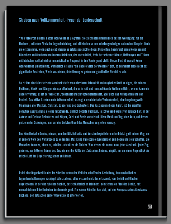 Alle verehrten Helden, hatten wohlwollende Biografen. Sie zeichneten unermüdlich dessen Werdegang für die Nachwelt, mit einer Firnis der Legendenbildung, und stilisierten so den anbetungswürdigen nationalen Kämpfer. Doch die erstaunliche, wenn auch nicht klassische Erfolgsgeschichte dieses Dirigenten, beschreibt einen Menschen mit einem Löwenherz und überbordenden inneren Reichtum, der unermüdlich, trotz oft herrschender Misere, Hoffnungen und Träume mit höchstem, radikal ehrlich humanistischen Anspruch, in den Vordergrund stellt. Dieses Porträt braucht keine wohlwollende Bilanzierung, denn wenngleich es auch die "andere Seite der Medaille" gibt, so schmälert diese nicht das gigantische Besteben, Werte vorzuleben, Orientierung zu geben und glaubhaftes Vorbild zu sein. So ist ihm eine künstlerische Ausdruckstiefe von unfassbarer Intensität und magischer Kraft zu eigen, die seinem Publikum, Musik und Klangerlebnisse offenbart, die es in zeit- und raumauflösende Welten entführt, wie es kaum ein anderer vermag. Es ist der Wille zur Ergebenheit und zur Opferbereitschaft, aber auch das Aufbegehren und der Protest, Das aktive Streben nach Vollkommenheit, erzeugt die solidarische Verbundenheit, eine hingebungsvolle Umarmung aller Musiker, Solisten, Sänger und des Orchesters. Das Faszinosum dieser Kunst, ist die ergriffen demütige Ausstrahlung, die das mitatmende, sinnlich betörte Publikum, in schwebend explosiver Balance hält, in der Askese und Ekstase fusionieren und Körper, Geist und Seele vereint sind. Diese Musik umfängt eine Aura, auf dessen pulsierenden Schwingen, man auf den tiefsten Grund des Menschen zu gleiten vermag.